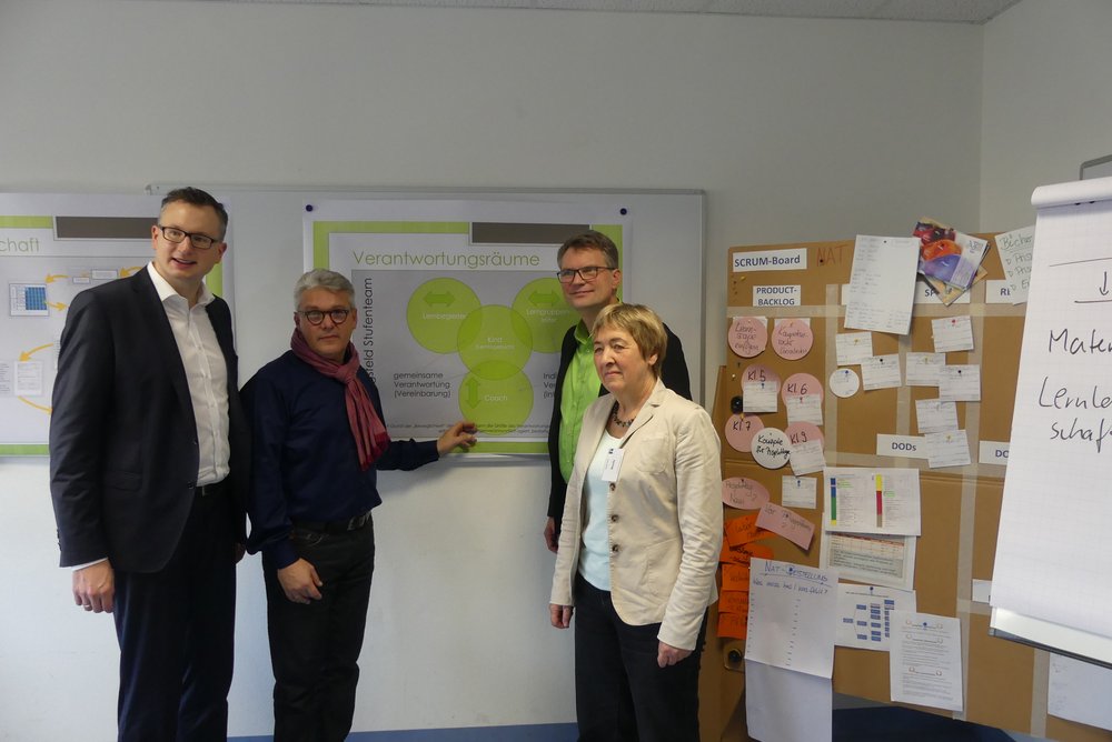 Der Direktor der Schule, Volker Arntz präsentierte die Arbeitsweise der Lehrkräfte an der Schule, mit der die Unterrichtskonzepte für die Lernbegleiter, die Lerncoaches und die Fachgruppenleiter erarbeitet werden. Dabei erläuterte Volker Arntz, welche Funktionen diese drei – in der Regel unterschiedlichen – Lehrer im Bildungsprozess jedes einzelnen Schülers haben, um ein optimales Lernergebnis erzielen zu können. Ziel müsse es sein, führte Arntz aus, jede einzelne Schülerin und jeden einzelnen Schüler individuell zu betrachten und je nachdem, welche Fähigkeiten und welche Zuverlässigkeit die Schülerin oder der Schüler haben, einen individuellen Entscheidungsspielraum bei der Auswahl der Aufgaben einzuräumen.