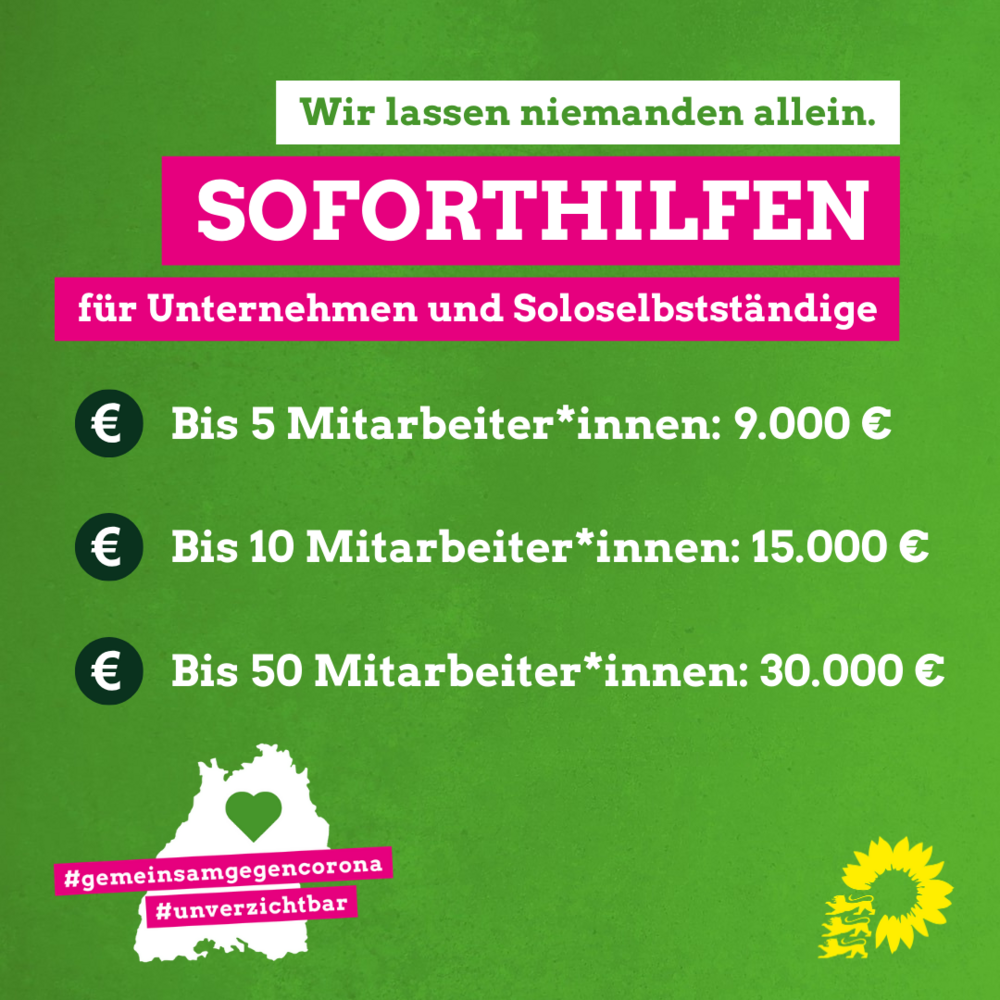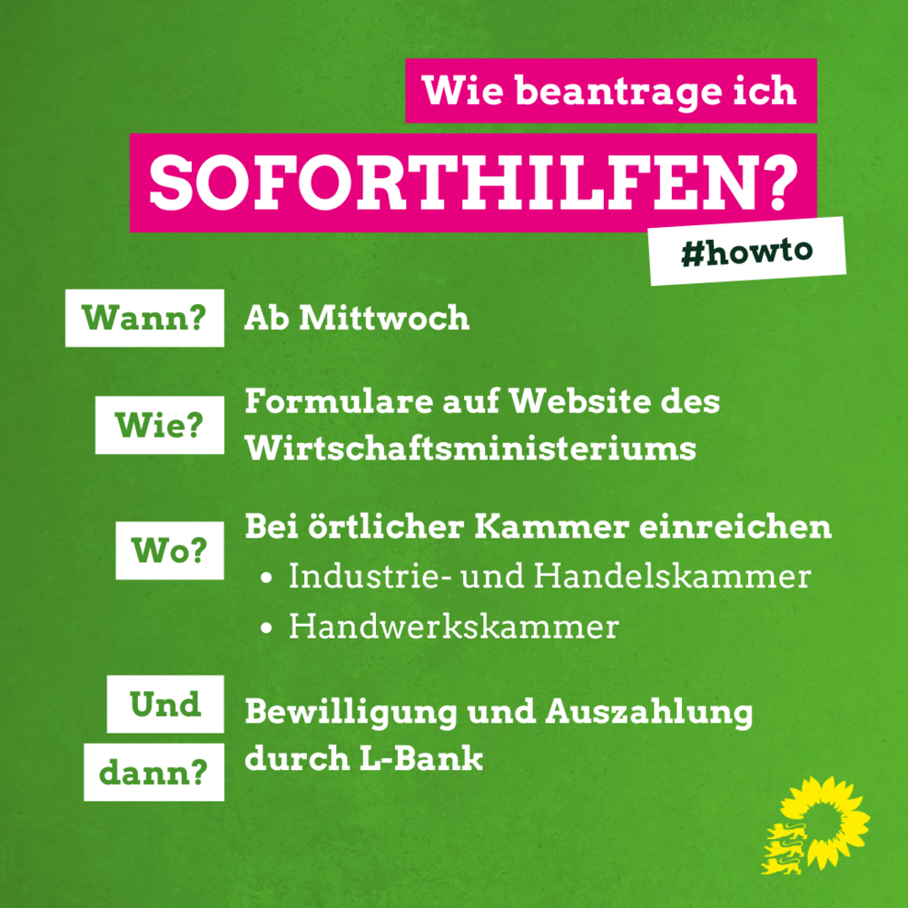 „Die grün-geführte Landesregierung greift Klein-Unternehmen und Solo-Selbstständigen mit bis zu 30 000 Euro unter die Arme“, erklärt der Grünen-Abgeordnete Thomas Hentschel. Das Kabinett habe die Hilfe am Sonntagabend frei gegeben, die genauen Konditionen seien jetzt geregelt. Anträge können demnach von diesem Mittwoch an (25. März) bei den Industrie- und Handelskammern und Handwerkskammern vor Ort gestellt werden. Die L-Bank zahlt das Geld aus.