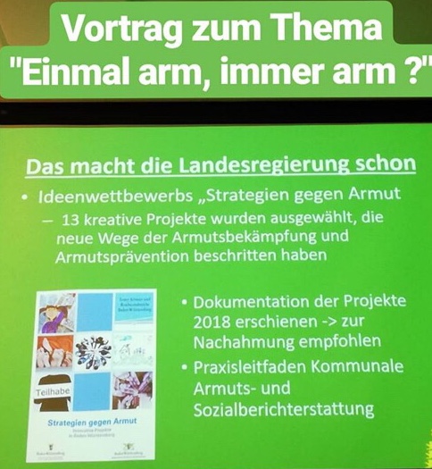Thomas Poreski, sozialpolitischer Sprecher der grünen Landtagsfraktion, führte anhand seines Vortrag zum Thema „Wege aus Armut und sozialer Ausgrenzung“ aus, welche Maßnahmen die grün geführten Landesregierungen in Baden-Württemberg seit 2011 angestoßen haben um Teilhabe zu verbessern. Dabei geht es nicht nur um die materielle Situation von Betroffenen sondern um die Teilhabe an Kultur, Sport und Bildung.