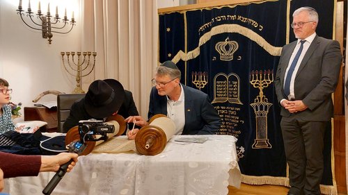 In Anwesenheit der Gäste zu denen auch die Oberbürgermeister von Baden-Baden und Rastatt, Dietmar Späth und Hans Jürgen Pütsch, Hatice Özütürk, Vorsitzende des interreligiösen Vereins „Brücke für den Dialog“ sowie mein Kollege Jonas Weber MdL und der Grüne Baden-Badener Stadtrat Thomas Gönner gehörten, wurden die letzten Buchstaben der Torarolle vollendet.