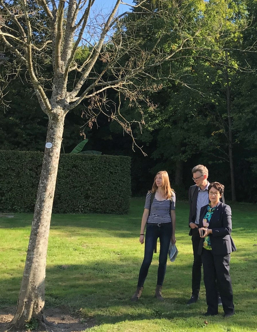 Der Rastatter Grüne Landtagsabgeordnete Thomas Hentschel und seine Ettlinger Landtagskollegin Barbara Saebel informierten sich im Garten des Schloss Favorite in Rastatt-Förch über den Baumzustand nach den Hitzesommern. Saebel hatte in ihrer Eigenschaft als Sprecherin für Kulturliegenschaften der Grünen Landtagsfraktion im Frühsommer über eine Kleine Anfrage an die Landesregierung erfahren, dass auch dieser historische Garten unter dem Klimawandel leidet. Experten befürchten schon lange, dass man den Klimawandel in Baden-Württemberg insbesondere im Rheintal spüren wird und sich hier die Folgen als Erstes und am ausgeprägtesten zeigen. Durch die im 19. Jahrhundert durchgeführte Rheinbegradigung Tullas ist der Grundwasserspiegel um mehrere Meter abgesunken. Damit ist etwa die Wasserversorgung im Schwetzinger Schlossgarten nur auf Niederschlag ausgelegt – es gibt keine Puffer für Dürrezeiten. Die bei den Schlössern und Gärten Baden-Württembergs (SSG) unter anderem für den Schlossgarten Favorite zuständige Gartenkonservatorin Dr. Meike Kirscht weist in der Führung darauf hin, dass sich die Bäume und insbesondere Buchen viel zu früh herbstlich färben, „aber die wahren Folgen des Hitzesommers 2018 sehen wir erst 2020“. Braune Blätter oder schon kahle Äste direkt neben leuchtend grünen Bäumen machen bereits jetzt den Unterschied zwischen geschädigten und nicht so hitzeanfälligen Baumarten deutlich sichtbar.
