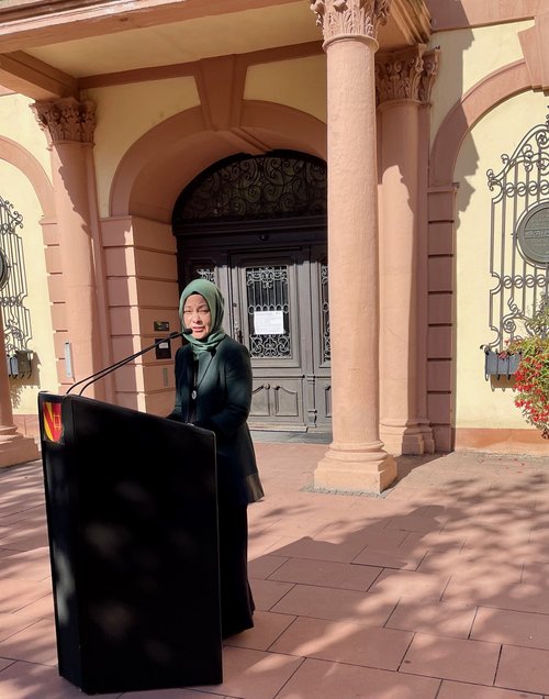 Hatice Özütürk, Vorsitzende des interreligiösen Vereins „Brücke für den Dialog“ erhielt den Applaus der etwa 60 Anwesenden als sie in ihrer Ansprache betonte, dass Gewalt niemals eine Lösung ist. Im Anschluss sprach sie eine Fürbitte für den Frieden in Israel und Palästina.