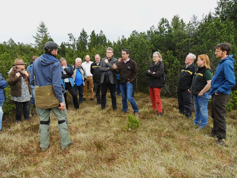 Als einer der regional gefragtesten touristischen Naturereignisse zieht der Kaltenbronn, mit seiner beeindruckenden Hochmoorlandschaft, inmitten im Naturpark Schwarzwald Mitte/Nord, jährlich tausende Besucher an. Um dieser hohen Besucherzahl gerecht zu werden, ist ein gutes Besucherlenkungskonzept mit einer entsprechenden Parkraumbewirtschaftung sowie einer Verbesserung des ÖPNV dringend erforderlich, betonten die (Mit-)Verantwortlichen des Kaltenbronn in der Gesprächsrunde. Zugleich standen zukünftige Ideen für eine Renaturierung des Hochmoores auf der Agenda der Gesprächsrunde und der im Anschluss eineinhalbstündigen Exkursion durch das Wildseemoor. Geführt wurde die Exkursion von Dr. Pascal von Sengbusch, Gutachter und Berater für Moorkunde, der die problematische Entwicklung des Moores vor Ort veranschaulichte. Der Zustand des Moores zeigt sich kritisch, da bereits große Bereiche eine Rückentwicklung und Absenkung verzeichnen. „Um dem Verlust von Kulturlandschaften entgegenzuwirken, hat das Land die Fördermittel für die Erhaltung von Naturlandschaften, wie beispielsweise die Renaturierung von Mooren erhöht“ erklärte Baumann und ergänzte, dass eine gute Planung und Zusammenarbeit aller Beteiligten für eine erfolgreiche Renaturierung eines Moores entscheidend sei.