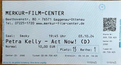 Gestern hatte ich für unsere kleinen Reihe „Grünes Kino“ den neuen Dokumentarfilm „Petra Kelly -Act now“ ins Merkur Film-Center in Gaggenau-Ottenau geholt.