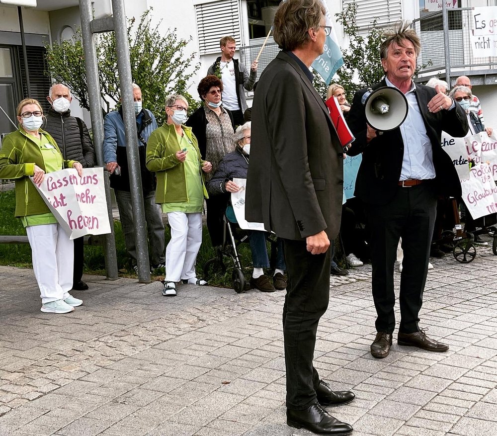Zuerst aber stellte sich Minister Lucha kurz nach seiner Ankunft spontan den kritischen Fragen des Pflegebündnis Mittelbaden, das mit einer Demo auf die schwierige Lage in der Pflege aufmerksam machte.